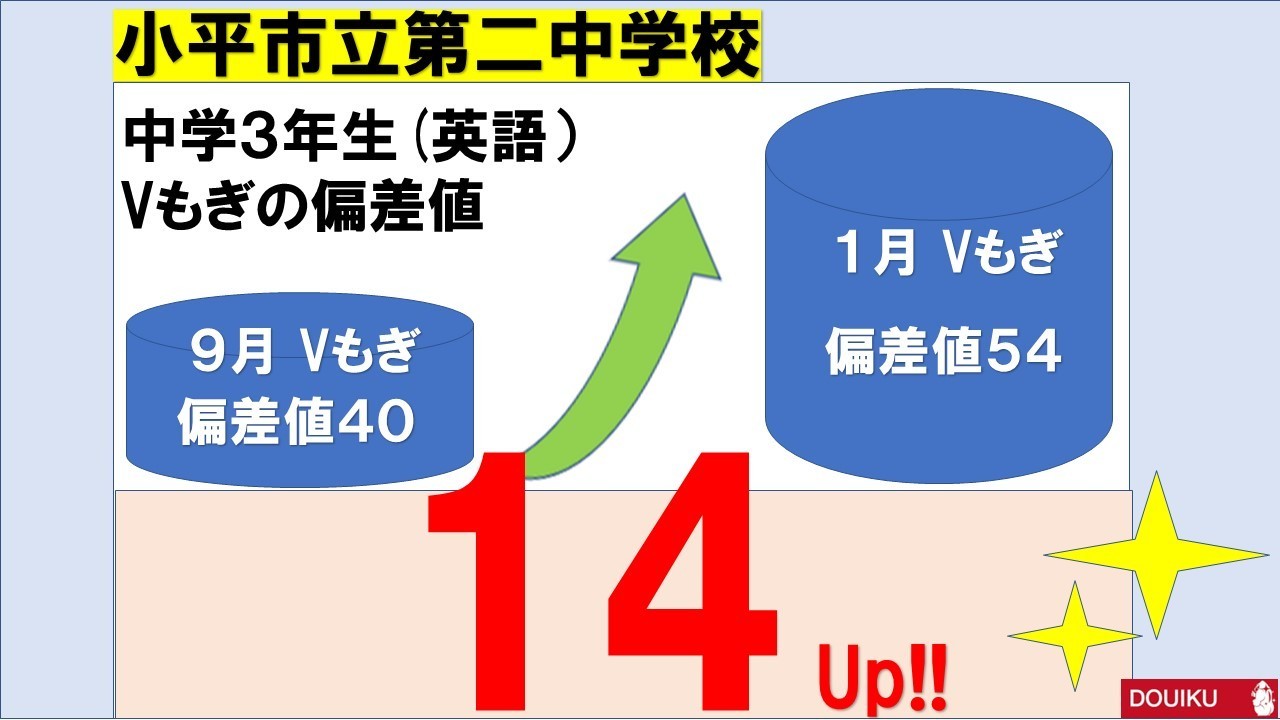 ■1/18(土)【中3】Vもぎの英語の偏差値「40→54」!!導育塾【新小平駅前教室数学・英語の専門性が高く、一人ひとりに向き合う進学塾、導育塾 新小平駅前教室、1/12(日)に実施されたVもぎの結果がでました!、すばらしい成果です!!、小平二中3年生、英語の偏差値が「14」も上がりました。日々の努力の成果です!!、本当にすばらしい!!