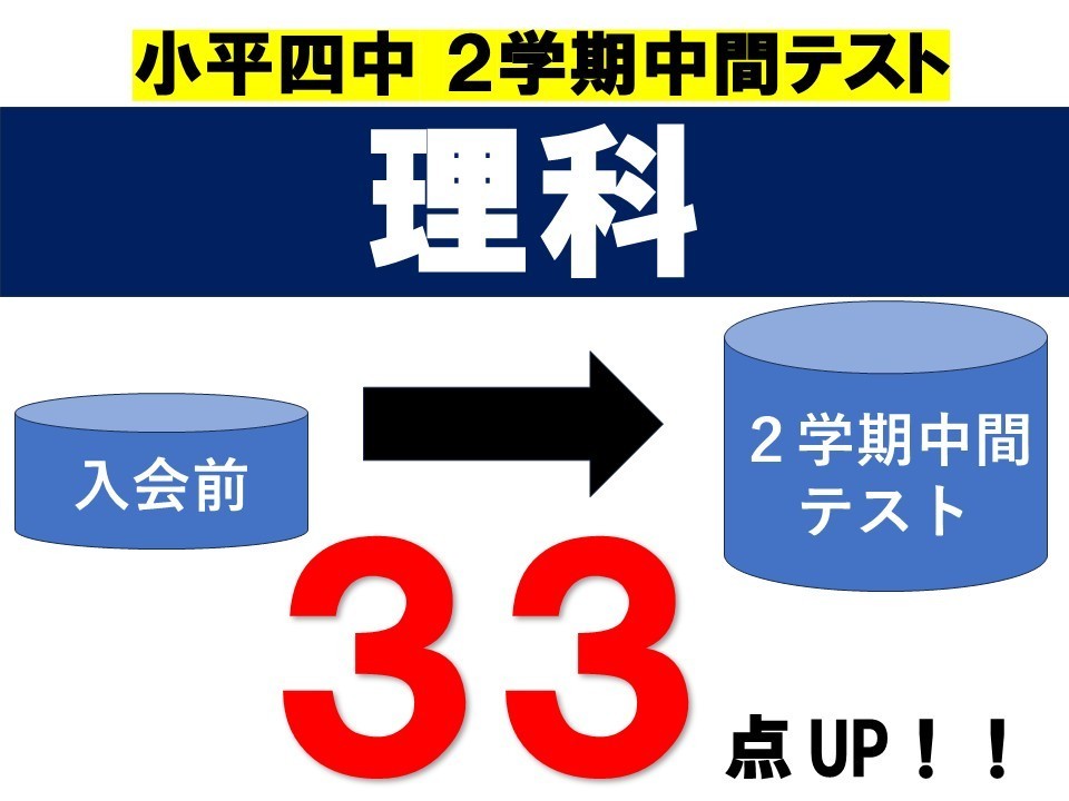■9/27(土) 小平四中の中間テスト「理科:33点UP!!!!導育塾【新小平駅前】数学・英語の専門性が高く、一人ひとりに向き合りに向き合う進学塾、導育塾 新小平駅前教室、すばらしい結果です!!、小平四中2学期中間テスト「理科:33点UP」!!、頑張りました!!